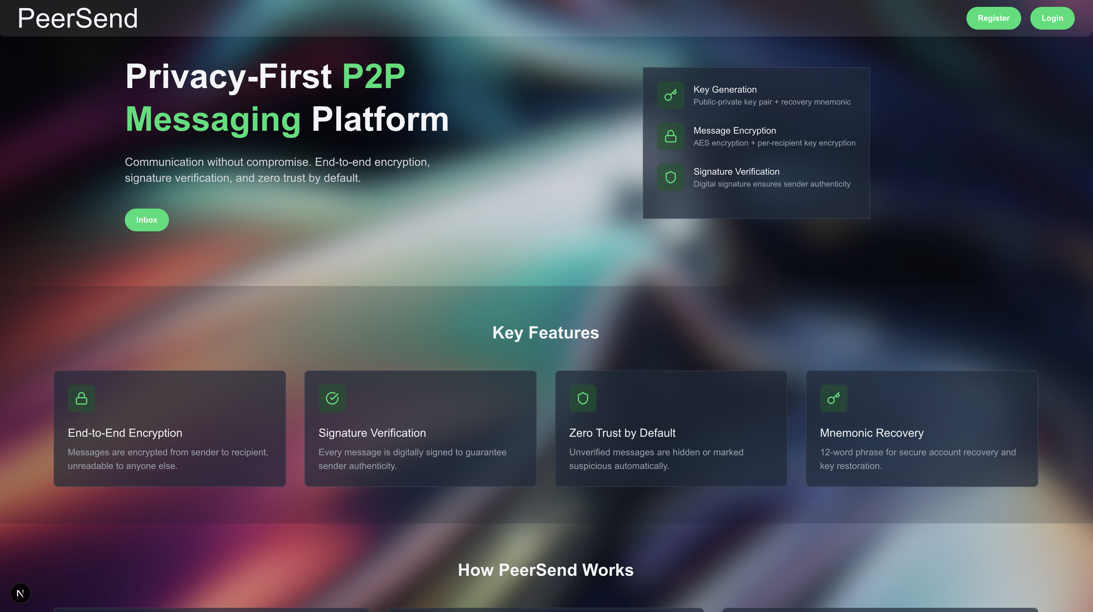 PeerSend is a privacy-first mailing platform that enables users to communicate securely with end-to-end encryption, ensuring that even the server cannot read message contents. Built with Next.js and PostgreSQL, PeerSend leverages advanced cryptographic techniques for unmatched data privacy and integrity.
